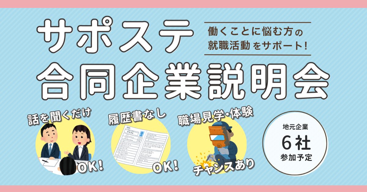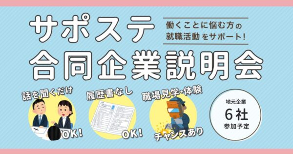 このページをシェアする 合説アイキャッチ (1200 x 630 px) 2026年1月8日 あなたも、サポステを使ってみませんか? 就職に関するご相談をお待ちしています。利用は無料です。お気軽にお問い合わせくださいね。 NEWSセミナー情報・ニュース 一覧を見る 2026年4月16日 あなたのコミュニケーションは何タイプ?一緒に考えてみましょう 普段の生活の中でも、仕事をし始めても、わたしたちは様々な方 ... MORE MORE 2026年3月27日 ~誰もが再挑戦できる、インクルーシブな社会へ~ 奈良県では全国同様人口減少が進行するなか、若年層の無業者や早期離職者の動 ... MORE MORE 2026年3月20日 「動けない理由」を知り、気持ちを理解する 「やらなければ」と思っていても動けない。「何をすればいいか」はわかっているのに ... MORE MORE BLOGブログ 一覧を見る 2026年3月9日 「サポステ合同企業説明会」を実施しました! 奈良県内に2ヶ所ある若者サポートステーションが合同で開催する、「サポステ合同 ... MORE MORE 2026年3月6日 「ストレス」を知り、対処の方法を知る 2026年2月27日(金)、奈良若者サポートステーションにて「働く自分を整えるセミ ... MORE MORE 2026年3月4日 BONCHIで「はたらく」をめぐるPICNICを。 2026年2月27日(金)、もちいどのセンター街にある創業支援施設B ... MORE MORE