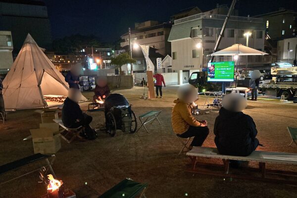 利用者さんたちはトークを聞きながら、途中からの参加者にチラシやアンケートを配ったり、焚き火の管理を行いました。