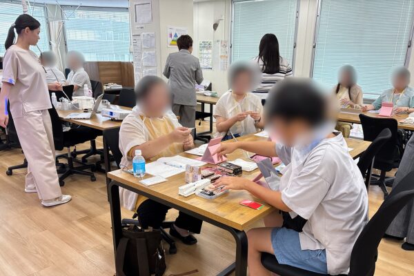 女性は、スキンケアの手順を座学で教わった後、メイクアップを実践で学びます。
