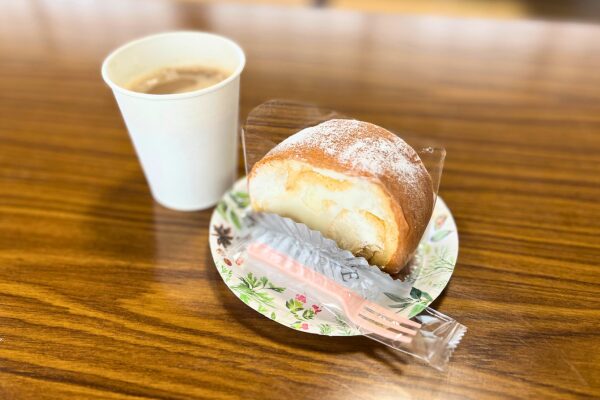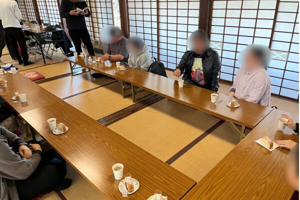 作業後は、参籠所に戻って茶話会の時間。みんなでロールケーキをいただき、あたたかい飲み物でほっと一息。
