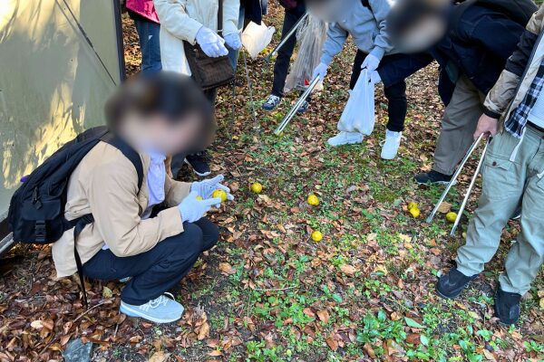 今回は境内のかりん拾いも行いました。たくさん落ちているかりんの汚れや痛みを確認しながら袋に入れていきます。