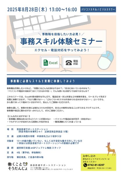 このページをシェアする 事務スキル体験セミナー 20250828 2025年7月16日 あなたも、サポステを使ってみませんか? 就職に関するご相談をお待ちしています。利用は無料です。お気軽にお問い合わせくださいね。 NEWSセミナー情報・ニュース 一覧を見る 2026年3月27日 ~誰もが再挑戦できる、インクルーシブな社会へ~ 奈良県では全国同様人口減少が進行するなか、若年層の無業者や早期離職者の動 ... MORE MORE 2026年3月20日 「動けない理由」を知り、気持ちを理解する 「やらなければ」と思っていても動けない。「何をすればいいか」はわかっているのに ... MORE MORE 2026年3月8日 自分に向いている仕事ってなんだろう?活かせる強みを見つけよう! 自分はどんなことを得意と感じているのか? ひとりではなか ... MORE MORE BLOGブログ 一覧を見る 2026年2月6日 出会い、ふれあい、巡り合い 2026年2月1日、生駒市の北コミュニティセンターISTAはばたきで開催された「第17回 ら ... MORE MORE 2026年1月30日 さまざまな仕事や職業観にふれてみよう! 1月27日に奈良若者サポートステーションにて「仕事のイメージを広げよう。いろんな ... MORE MORE 2026年1月27日 世界遺産「東大寺」をキレイに。 2026年1月24日、奈良若者サポートステーションの利用者さんとスタッフで、東大寺内の清 ... MORE MORE