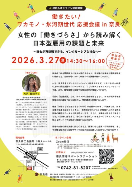 このページをシェアする 応援会議チラシ 2026年2月6日 あなたも、サポステを使ってみませんか? 就職に関するご相談をお待ちしています。利用は無料です。お気軽にお問い合わせくださいね。 NEWSセミナー情報・ニュース 一覧を見る 2026年4月16日 あなたのコミュニケーションは何タイプ?一緒に考えてみましょう 普段の生活の中でも、仕事をし始めても、わたしたちは様々な方 ... MORE MORE 2026年3月27日 ~誰もが再挑戦できる、インクルーシブな社会へ~ 奈良県では全国同様人口減少が進行するなか、若年層の無業者や早期離職者の動 ... MORE MORE 2026年3月20日 「動けない理由」を知り、気持ちを理解する 「やらなければ」と思っていても動けない。「何をすればいいか」はわかっているのに ... MORE MORE BLOGブログ 一覧を見る 2026年3月9日 「サポステ合同企業説明会」を実施しました! 奈良県内に2ヶ所ある若者サポートステーションが合同で開催する、「サポステ合同 ... MORE MORE 2026年3月6日 「ストレス」を知り、対処の方法を知る 2026年2月27日(金)、奈良若者サポートステーションにて「働く自分を整えるセミ ... MORE MORE 2026年3月4日 BONCHIで「はたらく」をめぐるPICNICを。 2026年2月27日(金)、もちいどのセンター街にある創業支援施設B ... MORE MORE
