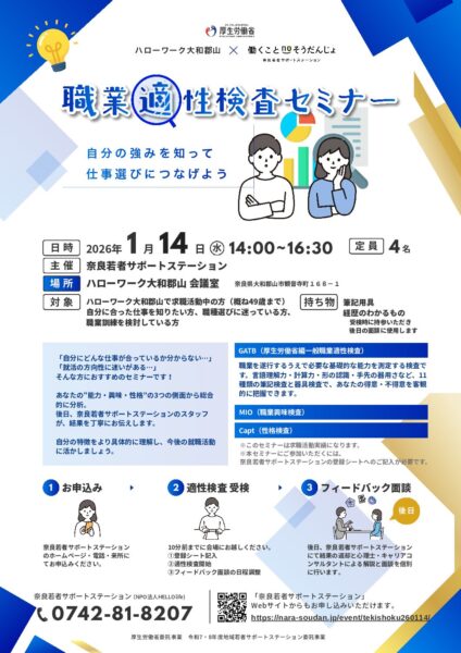 このページをシェアする 奈良サポチラシ (3) 2025年12月5日 あなたも、サポステを使ってみませんか? 就職に関するご相談をお待ちしています。利用は無料です。お気軽にお問い合わせくださいね。 NEWSセミナー情報・ニュース 一覧を見る 2026年3月27日 ~誰もが再挑戦できる、インクルーシブな社会へ~ 奈良県では全国同様人口減少が進行するなか、若年層の無業者や早期離職者の動 ... MORE MORE 2026年3月20日 「動けない理由」を知り、気持ちを理解する 「やらなければ」と思っていても動けない。「何をすればいいか」はわかっているのに ... MORE MORE 2026年3月8日 自分に向いている仕事ってなんだろう?活かせる強みを見つけよう! 自分はどんなことを得意と感じているのか? ひとりではなか ... MORE MORE BLOGブログ 一覧を見る 2026年2月6日 出会い、ふれあい、巡り合い 2026年2月1日、生駒市の北コミュニティセンターISTAはばたきで開催された「第17回 ら ... MORE MORE 2026年1月30日 さまざまな仕事や職業観にふれてみよう! 1月27日に奈良若者サポートステーションにて「仕事のイメージを広げよう。いろんな ... MORE MORE 2026年1月27日 世界遺産「東大寺」をキレイに。 2026年1月24日、奈良若者サポートステーションの利用者さんとスタッフで、東大寺内の清 ... MORE MORE
